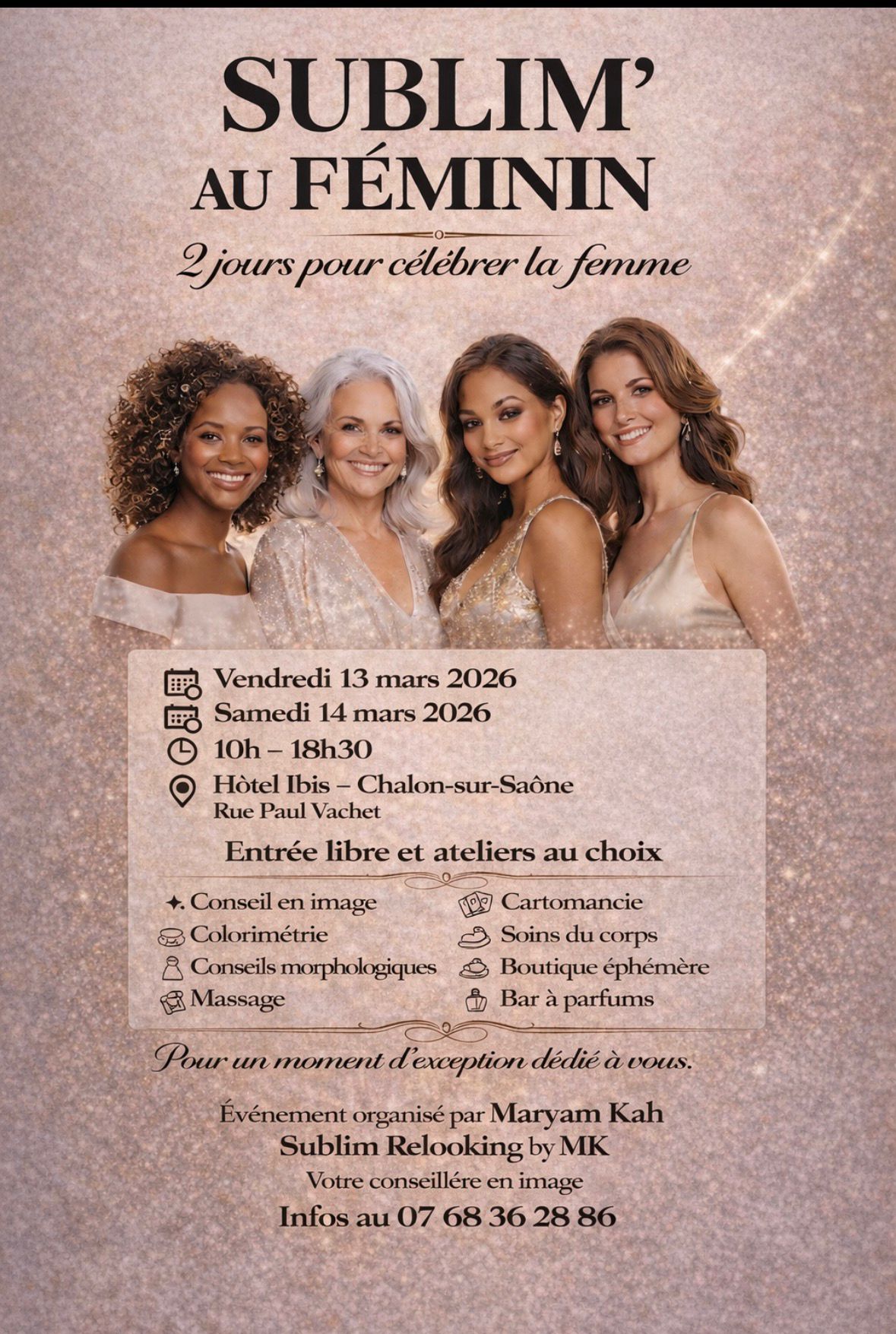 🌸 Les 13 et 14 mars 2026 Deux journées dédiées aux femmes à Chalon-sur-Saône Offrez-vous une parenthèse hors du temps… Les vendredi 13 et samedi 14 mars 2026, venez vivre deux journées entièrement consacrées à la femme, à la beauté, au bien-être et à la confiance en soi. Un événement